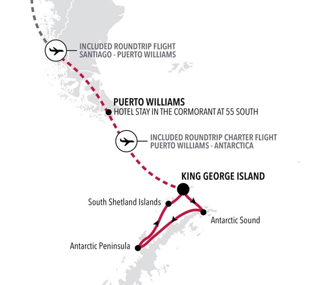 Please note the itinerary and route map are only tentative outlines of what you may experience. No specific itinerary, routing or landing sites can be guaranteed in advance. Where the ship actually sails will depend on a lot of factors including, but not limited to, the weather & ice conditions and the captain & expedition leader. Every trip is different, which adds to the excitement of expedition cruising in the polar regions. Trips with flights to and/or from Antarctica have a higher risk of having a trip delay or interruption due to weather.