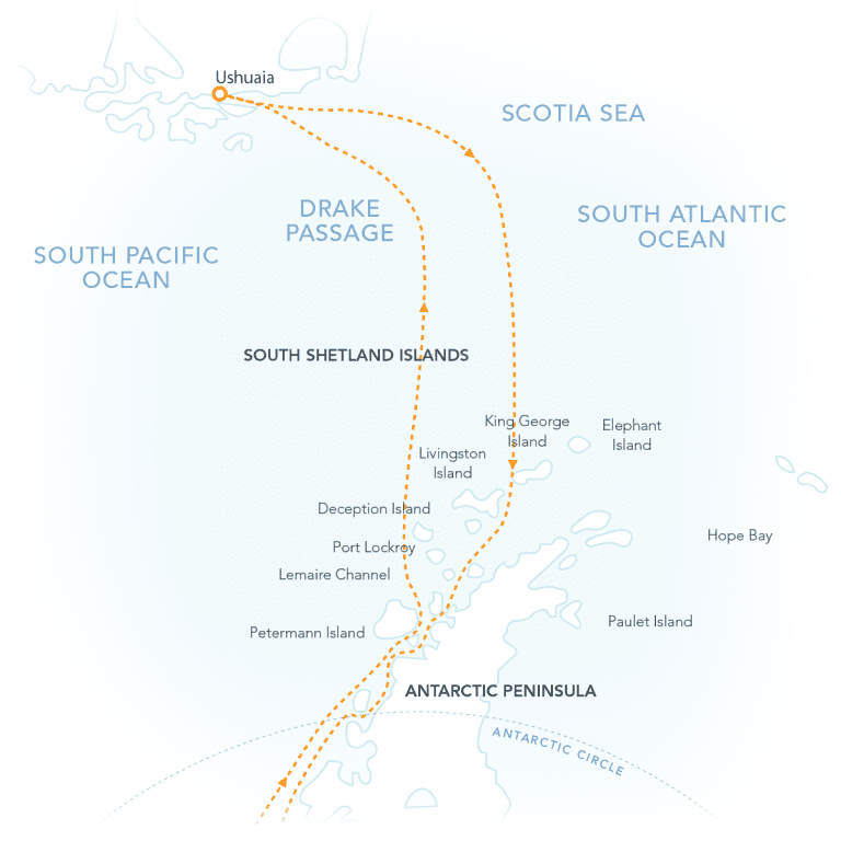 A Quest to go where few have gone before. We chart a course through the Drake Passage and along the Antarctic Peninsula with the ambition of crossing the Antarctic Circle. The farther south we go, the more sea ice we are likely to encounter, along with incredible wildlife and awe-inspiring scenery. Should we arrive at 66°33’S, we’ll join the small band of explorers that can claim they have made it this far south.