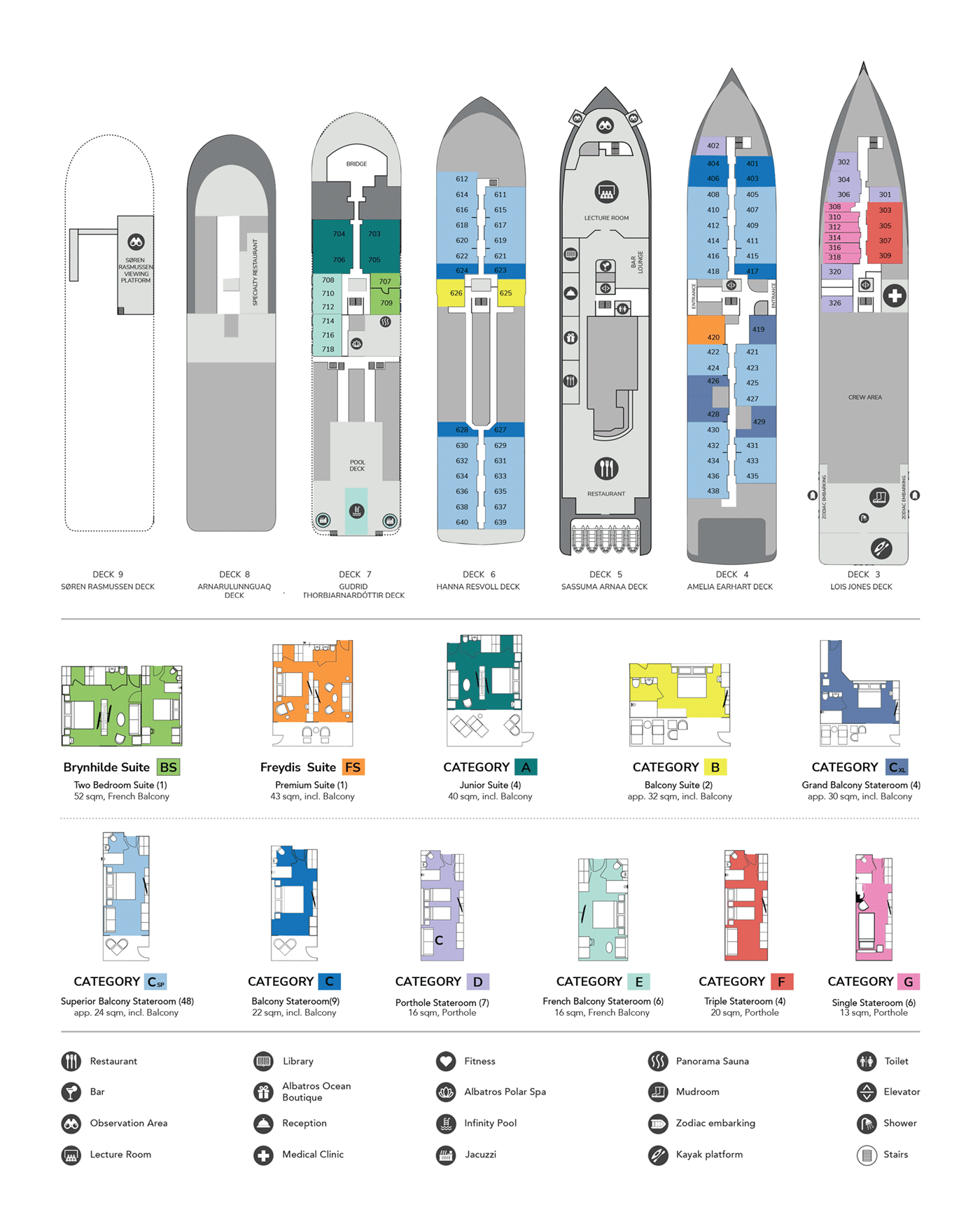 The Ocean Albatros is designed to keep Antarctica front and center, from wake-up to lights out. Every stateroom provides a generous view, and most include private balconies. A variety of observation decks are accessible from multiple indoor spaces. Two hydraulic platforms can be lowered to offer unprecedented near-water-level views – and rare photograph opportunities. Even the two outdoor Jacuzzis provide 360 views of the mesmerizing landscape that surrounds you. The Albatros is powered by two diesel and two electro engines, controlled electronically to optimize speed and fuel efficiency. Compared to traditional expedition ships, this technology allows the ship to reduce its carbon footprint by 50%.