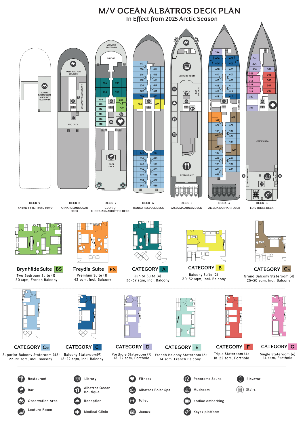With a total of 94 comfortable staterooms and suites, all with unobstructed sea view, most with their own balcony, the Ocean Albatros has become a very popular expedition cruise vessel. Like its sister ship the Ocean Victory it offers two restaurants, a wellness area, an Albatros Nordic Bar, an open deck dining facility, a modern lecture lounge, and other state-of-the-art amenities. The vessel has more than a 50% lower carbon footprint than traditional expedition vessels and is one of the most environmentally friendly, implementing the Green Initiative Program, ensuring both absolute comfort and sustainability for guests. Unlike the Ocean Victory, the Ocean Albatros also offers a unique panorama sauna, and even more dedicated solo travel cabins without a single-supplement.