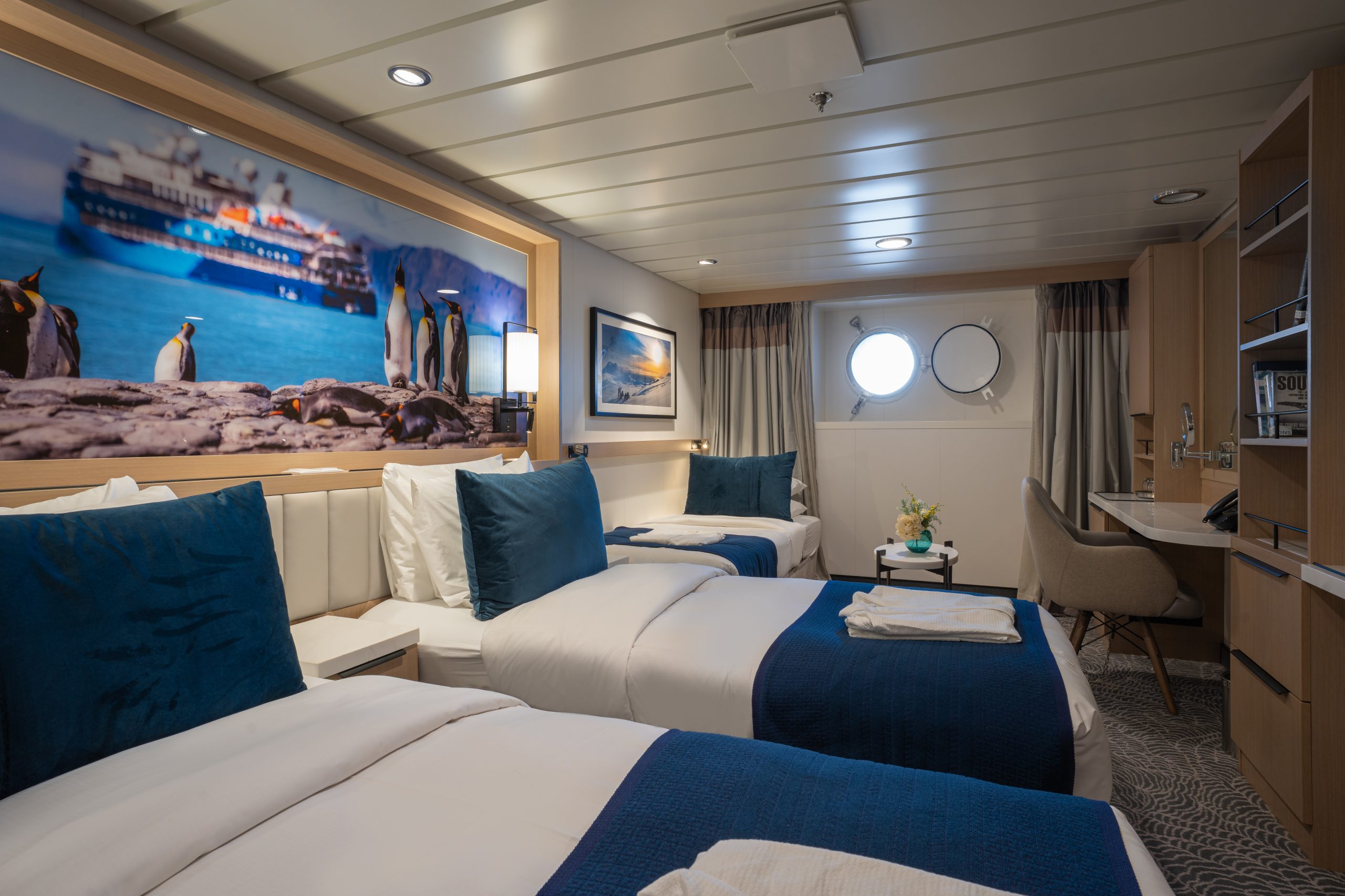 There are two Triple Staterooms on board Ocean Albatros featuring portholes and bathrooms. Triple staterooms are normally with three single beds however a double bed can be accommodated, while the third is a single bed. Located on Deck 3, they’re close to the mudroom and loading platforms.